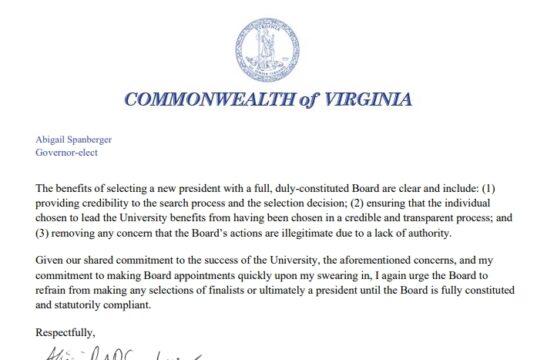 Governor-Elect Abigail Spanberger Calls On UVA Board of Visitors to Pause Presidential Selection