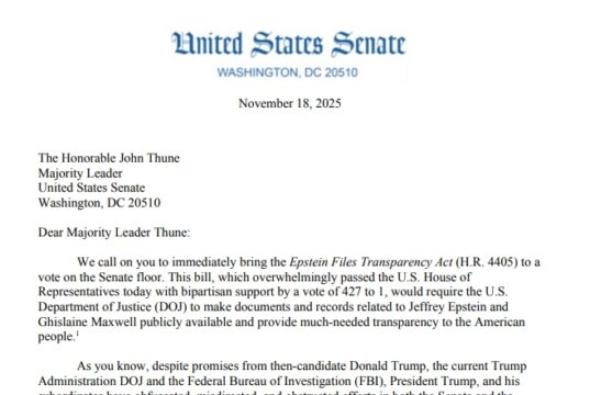 WARNER, KAINE CALL ON LEADER THUNE TO QUICKLY BRING THE EPSTEIN FILES TRANSPARENCY ACT TO FLOOR FOR VOTE