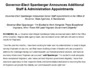 VA Governor-Elect Spanberger Announces Additional Staff in Office of the Governor & Administration Appointments