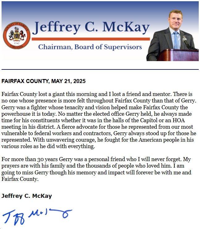 “I’ve known Gerry for more than 35 years. To me, he exemplified the very best of public service. Just this past Sunday, I was honored to join his wife Smitty, daughter Caitlin, and the Fairfax community in celebrating his decades of service. While Gerry couldn’t be there in person, his presence was felt throughout the room. He was there in spirit, as he always is when people come together in the name of service and progress.