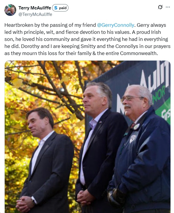 “Today, we mourn the loss of a true giant in Virginia politics and a tireless fighter for our Commonwealth. Congressman Gerry Connolly embodied what it means to be a public servant. Over decades of leadership — first as Chairman of the Fairfax County Board of Supervisors and then as a Congressman for 16 years — he demonstrated an unwavering commitment to the people of Fairfax County, Northern Virginia, and beyond.