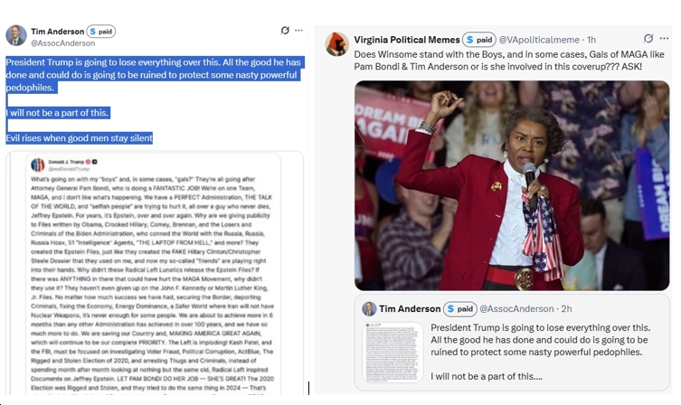 Which brings us to Virginia Political Memes’ hilarious tweet, snarkily asking, “Does Winsome stand with the Boys, and in some cases, Gals of MAGA like Pam Bondi & Tim Anderson or is she involved in this coverup??? ASK!”