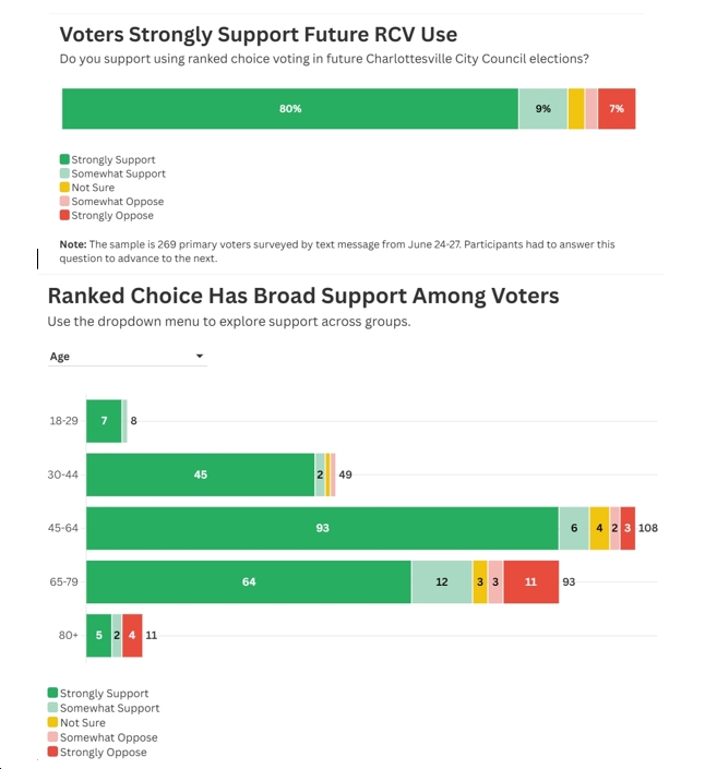| CHARLOTTESVILLE, VA – A survey of Charlottesville primary voters conducted one week after the City’s first ranked choice election found decisive support for continuing the system. Fully 80% of respondents strongly support using RCV in future City Council elections, with another 9% expressing some support. Less than 10% opposed continued use.