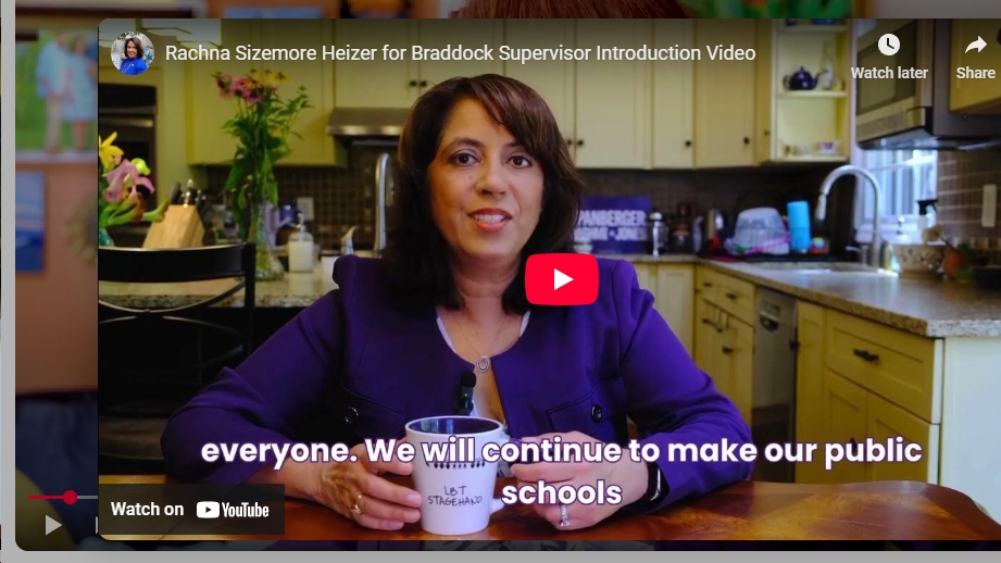For more information about Rachna Sizemore Heizer and her campaign for Braddock Supervisor, watch her campaign announcement video or visit: ElectRachna.com