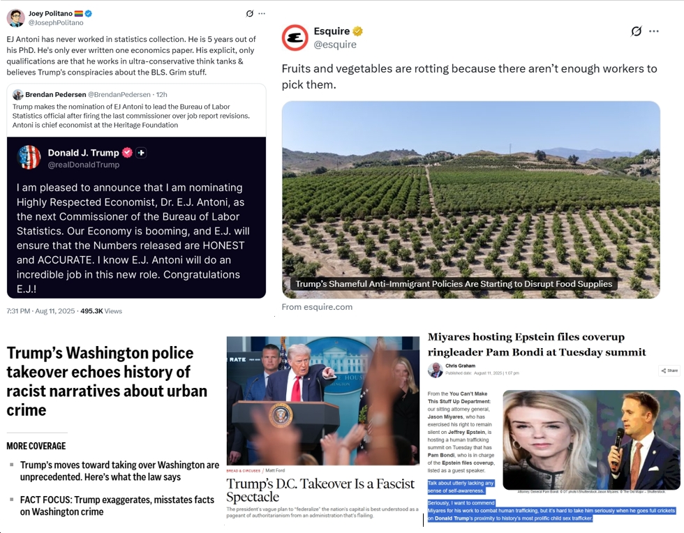 - In a Gross Exaggeration of Fact, Trump Deployed the National Guard in D.C. to “Jail” Violent Criminals (“Crime in the nation’s capital is actually at a 30-year low. But that won’t stop the president from evicting the homeless too.”)