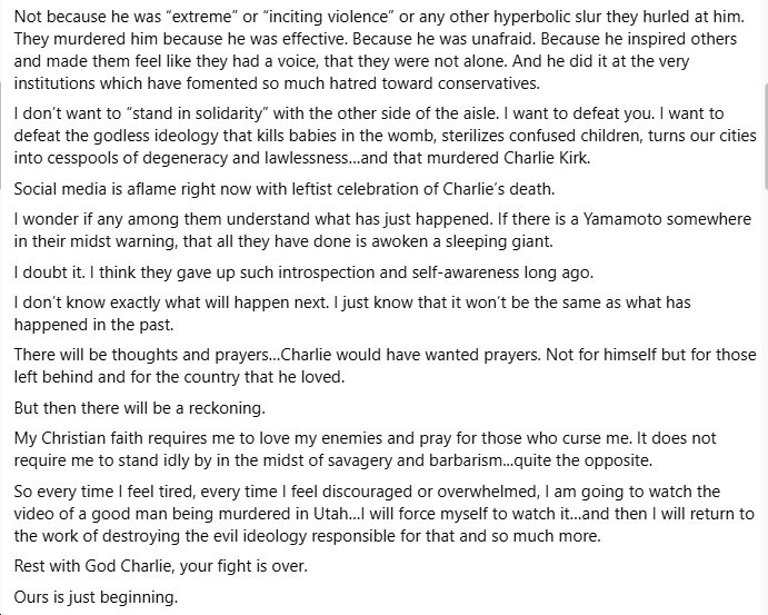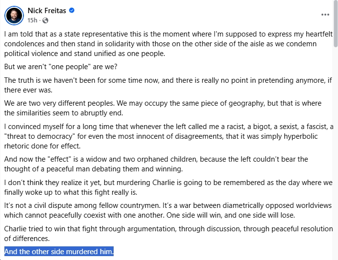 From Speaker Don Scott, in response to the Facebook post by VA Del. Nick Freitas, a right-wing Republican (see screenshots of his post, below), in which Freitas claimed with zero evidence that “the other side murdered” Charlie Kirk. In fact, as Speaker Scott points out, that charge is “without any proof or facts,” while noting that “Democrats I served with have denounced the horrific shooting and expressed our condolences to the family of Mr. Kirk.” Also, in Freitas’ post, he refers to “the work of destroying the evil ideology responsible for that and so much more” and “It’s not a civil dispute among fellow countrymen. It’s a war between diametrically opposed worldviews which cannot peacefully coexist with one another.” As Speaker Scott says, it’s “sad” that Freitas would use such language. Also, according to Freitas, apparently liberalism, progressivism, or even just being a Democrat is that “evil ideology,” and is somehow “responsible for [Kirk’s murder] and so much more.” Needless to say, that is false, irresponsible, reckless and dangerous rhetoric that should have no place in our politics or in our country.