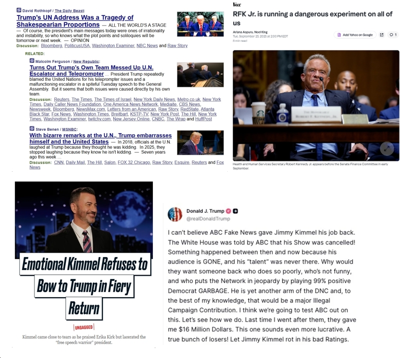 - Emotional Kimmel Refuses to Bow to Trump in Fiery Return to TV (“Kimmel came close to tears as he praised Erika Kirk but lacerated the ‘free speech warrior’ president.”)