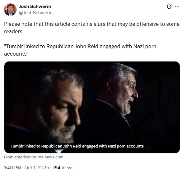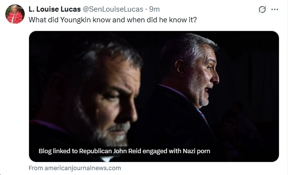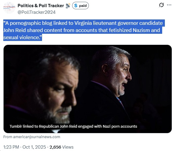 American Journal News: “A pornographic blog linked to Virginia lieutenant governor candidate John Reid shared content from accounts that fetishized Nazism and sexual violence.”