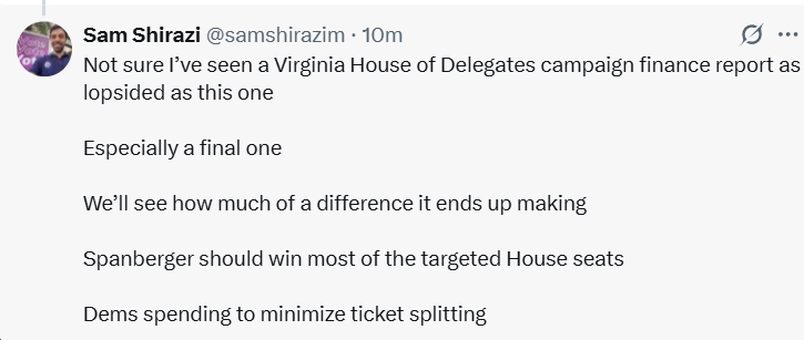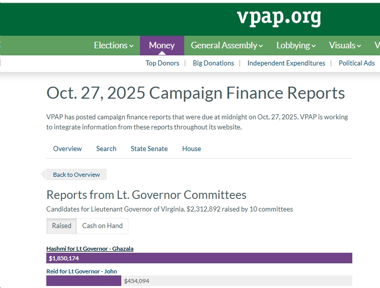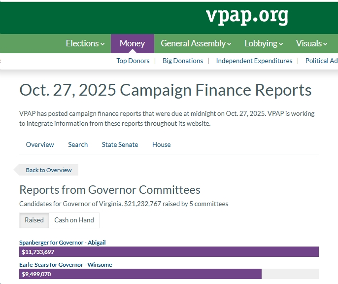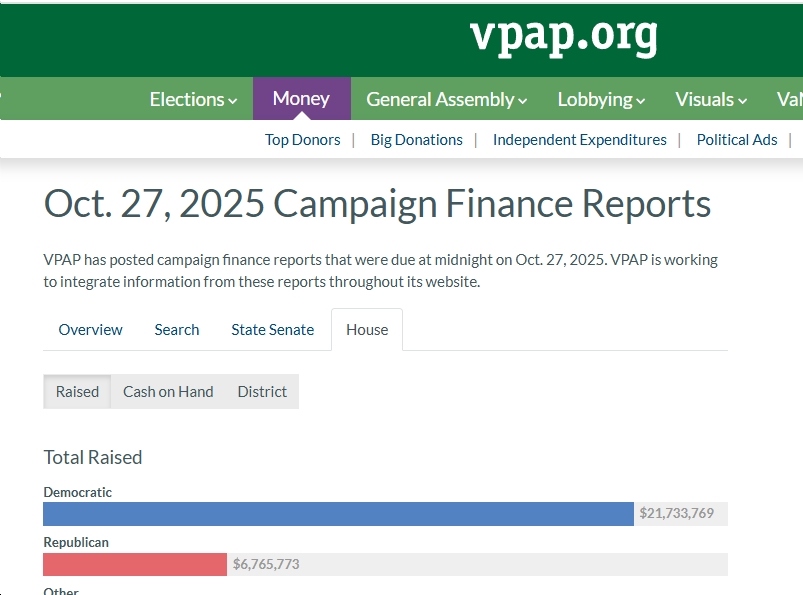 See below for some quick highlights, courtesy of VPAP, of the final campaign finance reports (for the perdio 10/1-10/23) prior to the 2025 Virginia elections next Tuesday. A few highlights include: