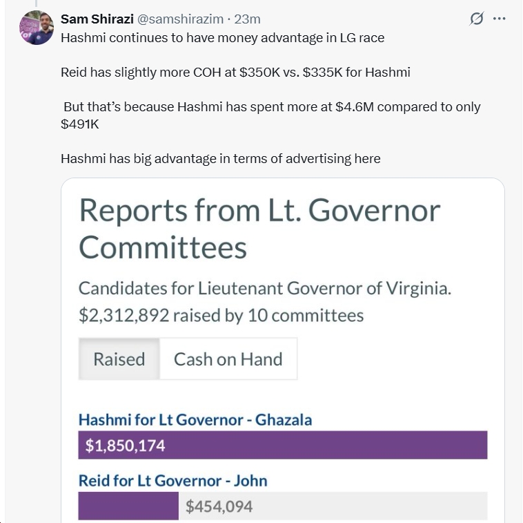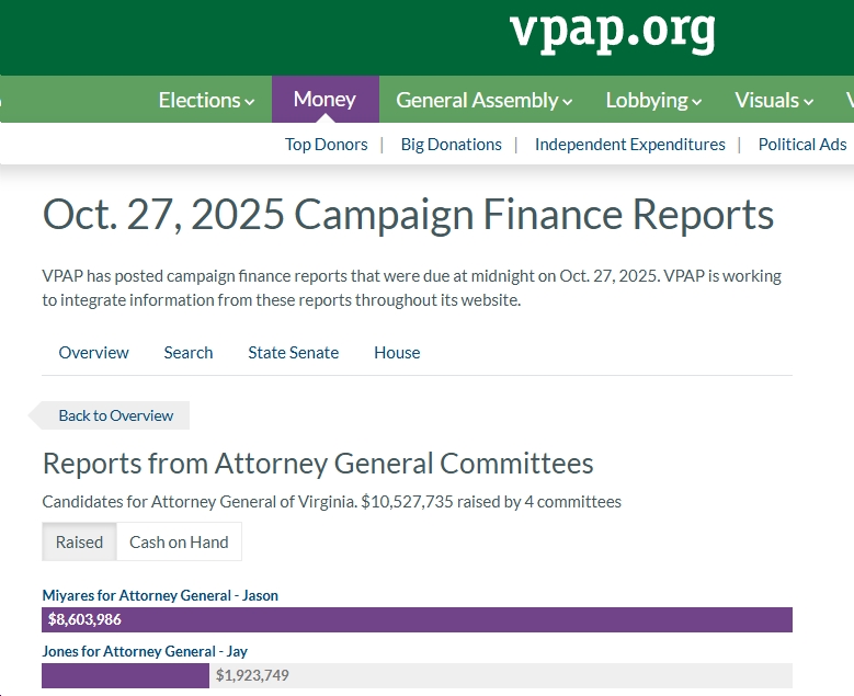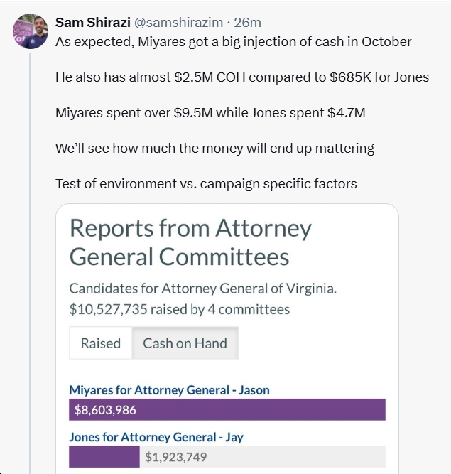 - For AG. Jason Miyares has far more cash-on-hand ($2.5M-$685k) than Jay Jones; also, Miyares raised far more money ($8.6M-$1.9M) during the period (10/1-10/23).