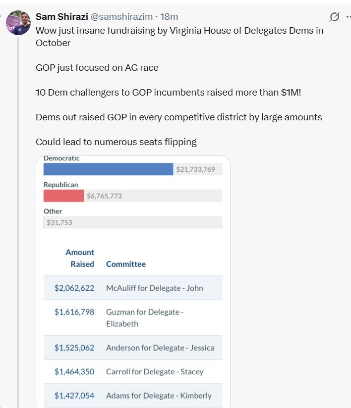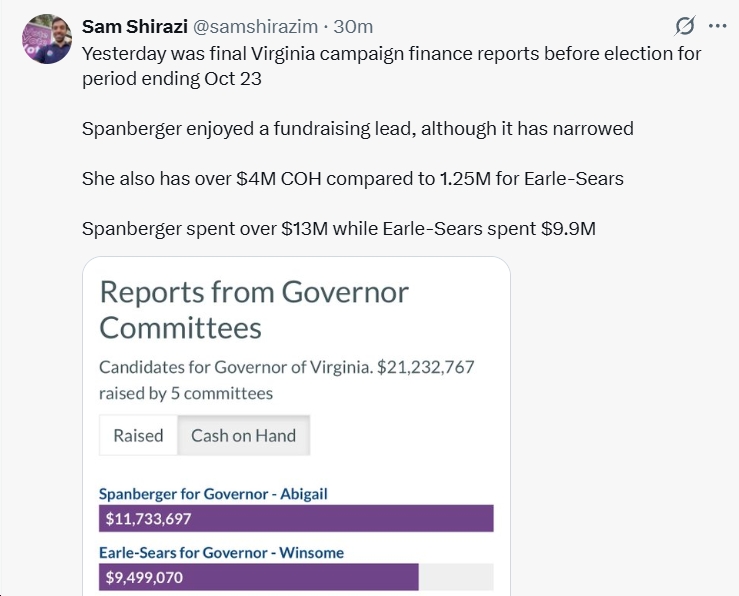 - For House of Delegates, Dems had $7.3M cash-on-hand vs. $5.2M for Republicans. Dems outraised Rs during the 10/1-10/23 period by a massive, $21.7M-$6.8M margin.