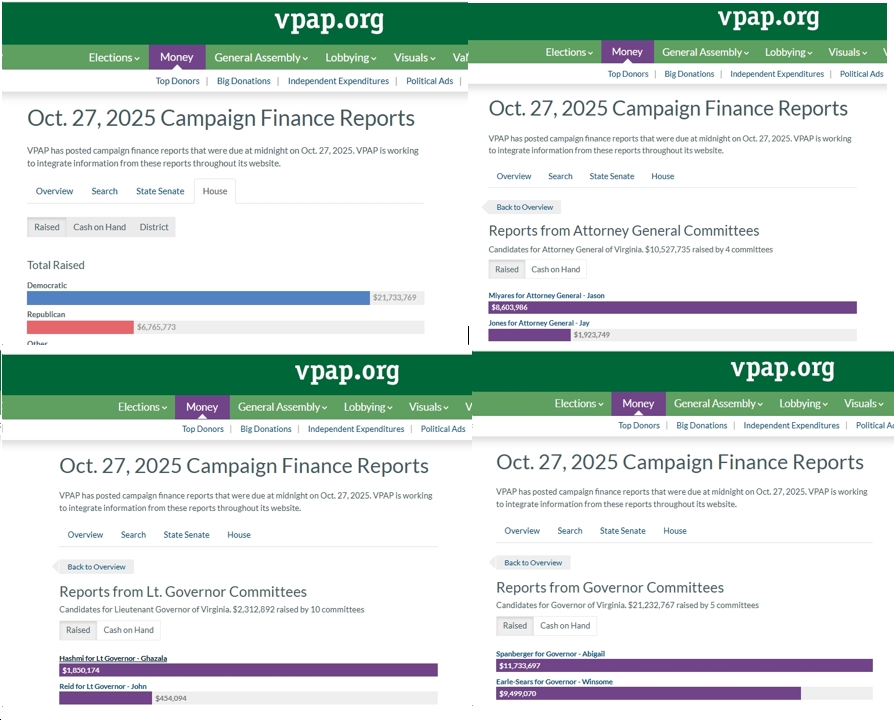 See below for some quick highlights, courtesy of VPAP, of the final campaign finance reports (for the perdio 10/1-10/23) prior to the 2025 Virginia elections next Tuesday. A few highlights include: