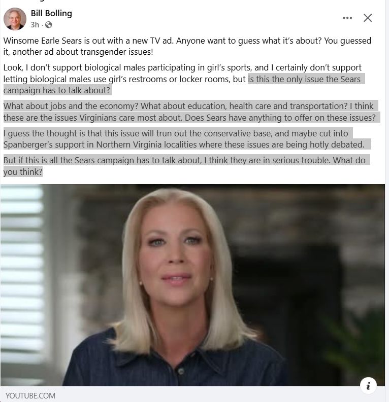 Excellent points by former VA Lt. Gov. Bill Bolling (R/Trump voter) about Winsome Earle-Sears egregiously dishonest, error-filled and nasty new ad. Among the errors in this monstrosity by the Earle-Sears campaign: 1) the 105th Congress was in 1997-1999, when Abigail Spanberger was just 18-20 yrs old and in college; 2) the Equality Act was written by Rep. David Ciccilini (not by Spanberger) & introduced in 2015 (four years before Spanberger became a member of Congress); etc. Just sloppy error after sloppy error…falsehood-laden hot garbage, basically.