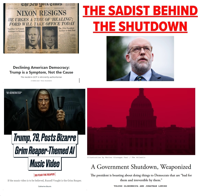 - Trump charts path to total control amid government shutdown (“Total control” = dictatorship.)