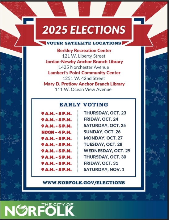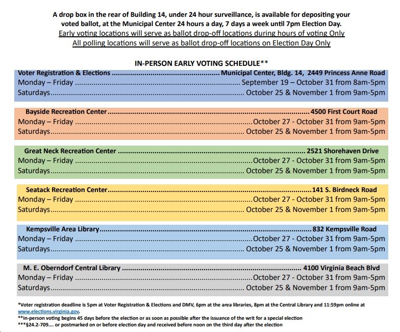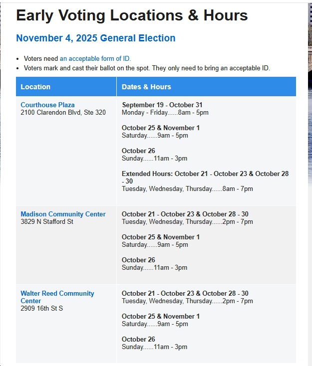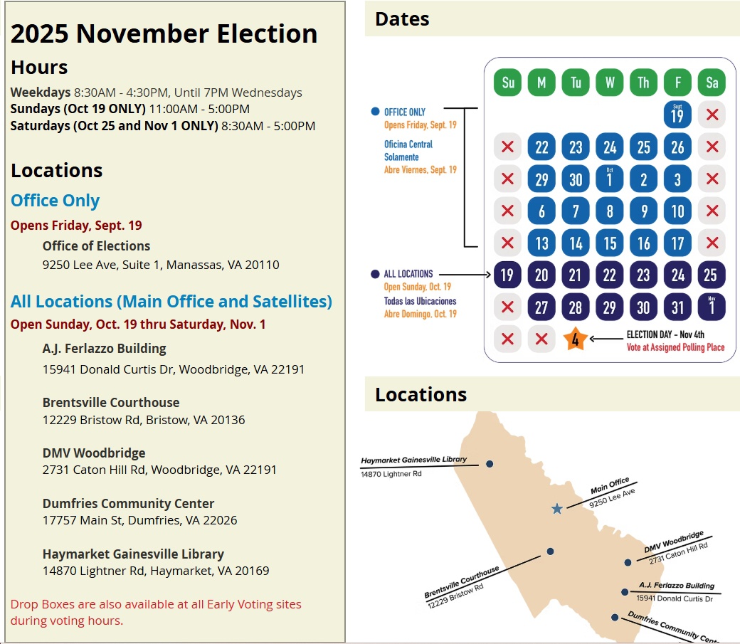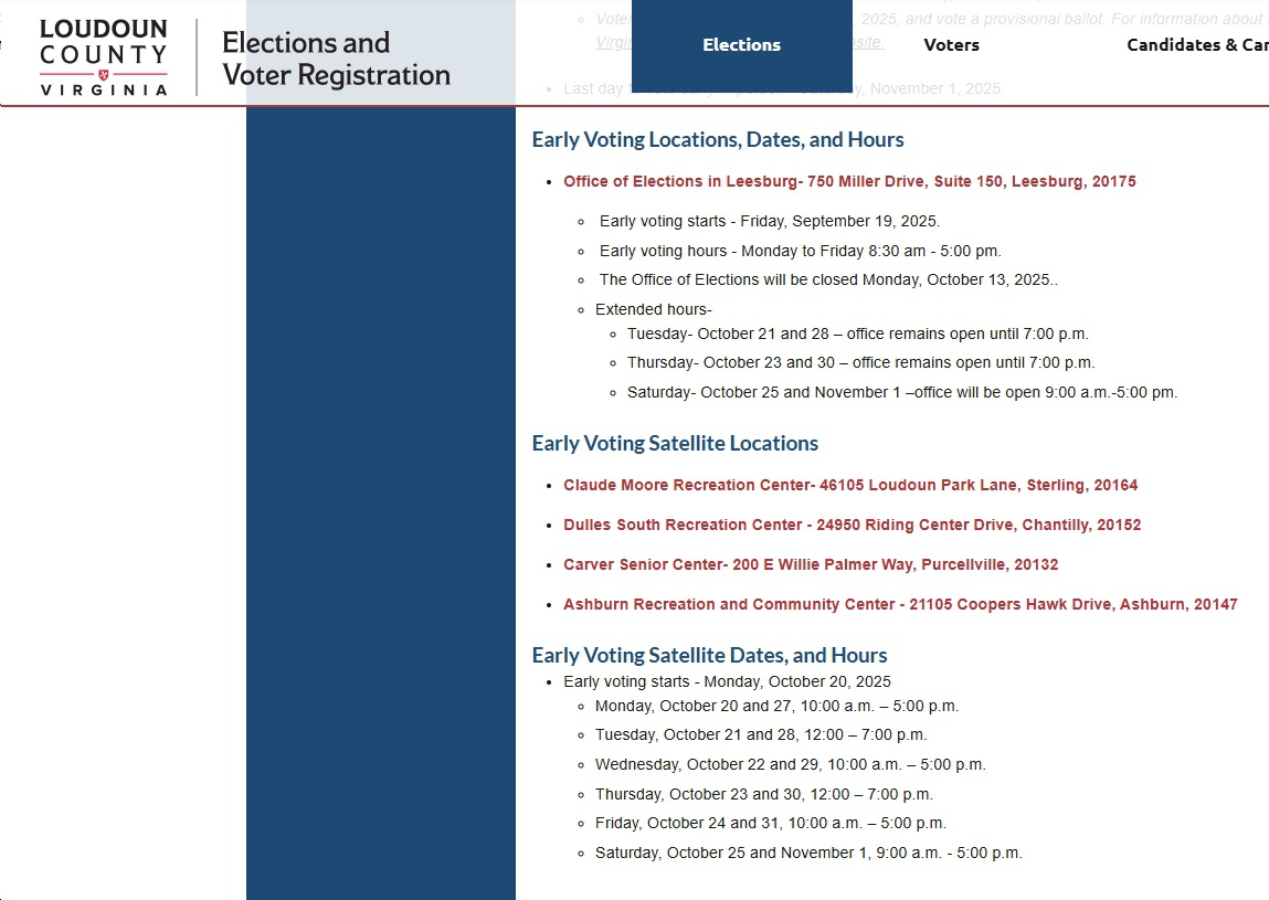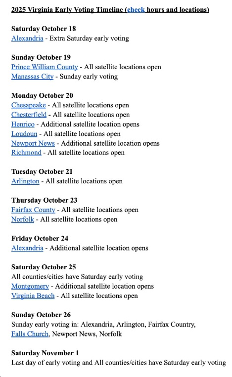 With just 23 days until election day on November 4, early voting is going strong, with over 500,000 early votes cast so far (according to this model, we’re currently at Democratic 56.5% / Republican 39.1%), and with extended hours/satellite voting locations starting in about a week in many major “blue” and “purple” jurisdictions. See below for a few…and make sure you vote BLUE either early in-person, early by-mail or on November 4 at your regular polling location!