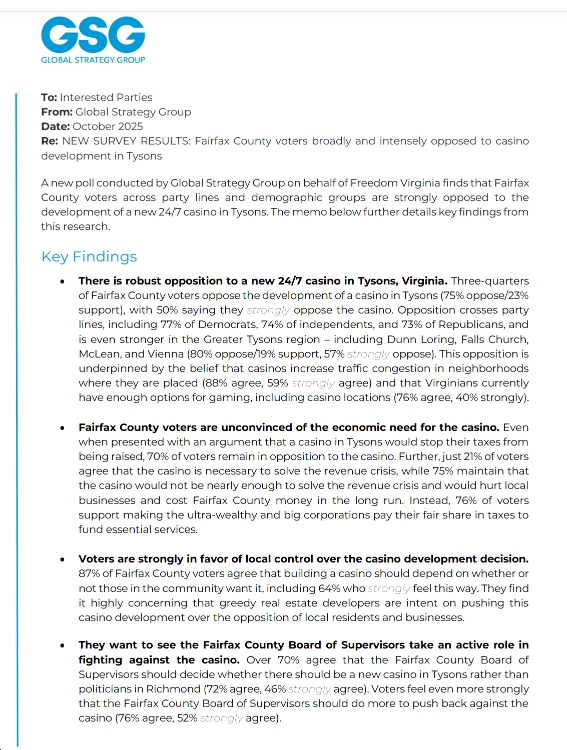 RICHMOND, Va. — Today, Freedom Virginia released polling conducted by Global Strategy Group across all of Fairfax County – including an oversample of Tysons Corner residents – that shows 75% of voters oppose a proposed new casino in Fairfax County. Of those 75% who oppose a casino, 50% of those voters strongly oppose a casino. Instead of pursuing unpopular ideas like a casino to generate revenues that address the county’s fiscal crisis, 76% of voters support tax restructuring so that corporations and the ultra-wealthy pay their fair share, like the middle-class already does. A memo with the full results can be read here.