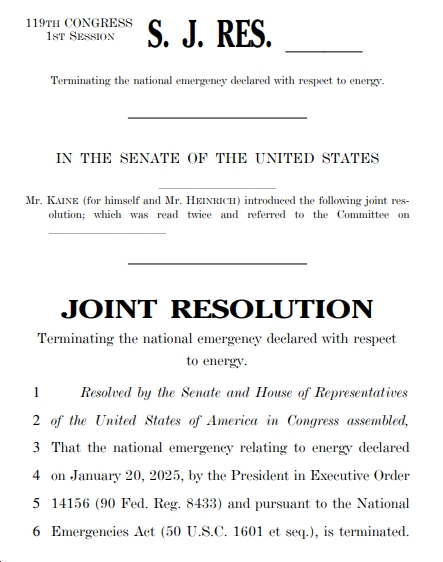 “President Trump told Big Oil donors that if they cut a $1 billion check to his campaign, he’d give them everything they want on day one of his presidency. Then, within hours of his inauguration, he declared a sham ‘energy emergency’ to put his thumb on the scale for those donors and hamstring other affordable energy sources,” said Kaine. “It turns out Trump himself is the energy emergency—energy prices are through the roof and hundreds of thousands of good-paying clean energy jobs are in serious jeopardy because of federal funding he yanked. I’m glad to team up with Senator Heinrich to give every senator the opportunity to stand with the American people who want lower energy costs and good jobs by challenging Trump’s corrupt energy agenda.”