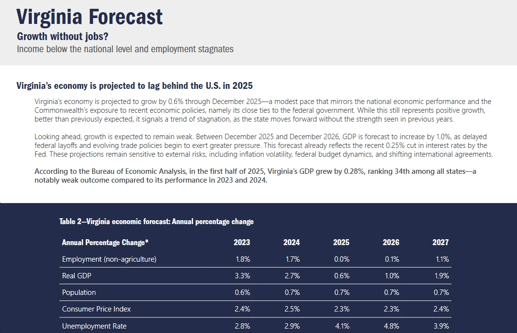 A new report from the University of Virginia’s Weldon Cooper Center attributes this weak outlook to “the Commonwealth’s exposure to recent economic policies, namely its close ties to the federal government.” Specifically, the report projects that Virginia’s unemployment rate will reach 4.1% by the end of 2025 — and reach 5.0% in mid-2026, the highest level since 2020.