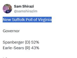 - New Non-Partisan State Navigate Poll: Spanberger +13 (55%-42%); Hashmi +11 (53%-42%); Jones +5 (50%-45%); HoD Dems +12 (53%-41%) (Youngkin’s approval rating at just 46%-47% (-1 point): Trump at 40%-59% (-19 points))