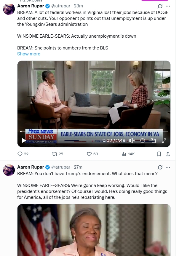 See below for some clips (courtesy of the amazing Aaron Rupar!) of Winsome Earle-Sears’ debacle of an interview this morning on Fox “News” (in air quotes, because obviously it’s not news). It’s pretty bad when even a right-wing-friendly, Trump-loving network like Fox “News” brutally fact checks Earle-Sears on one of her biggest lies (that, supposedly, “unemployment is down” under the Youngkin/Earle-Sears administration). In fact, as the Fox “News” fact check points out, Virginia’s unemployment rate is UP since Youngkin/Earle-Sears took office in January 2022, from 2.7% then to 3.6% in August (and rising). So…either Earle-Sears is just completely clueless about Virginia’s economic situation, or she’s just flat-out lying and assuming nobody will fact check her or take a minute to look up the correct numbers.