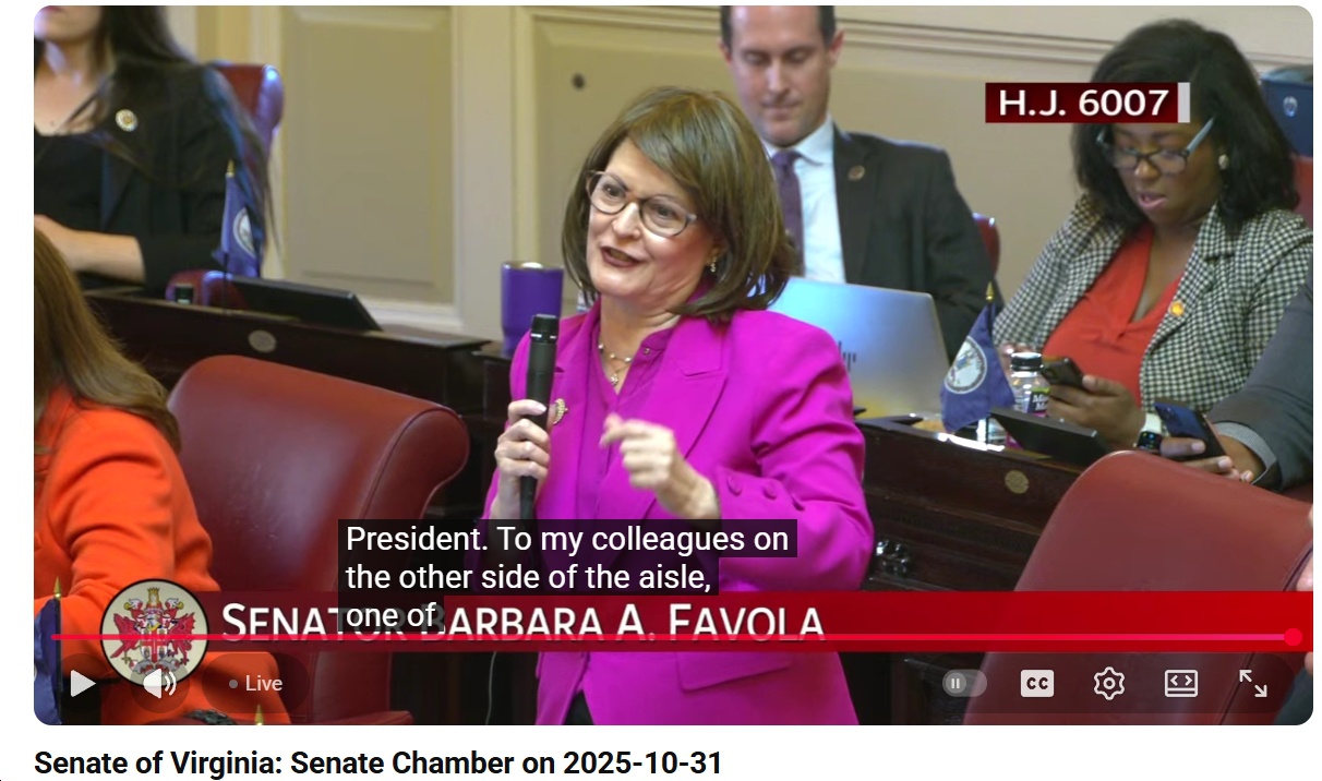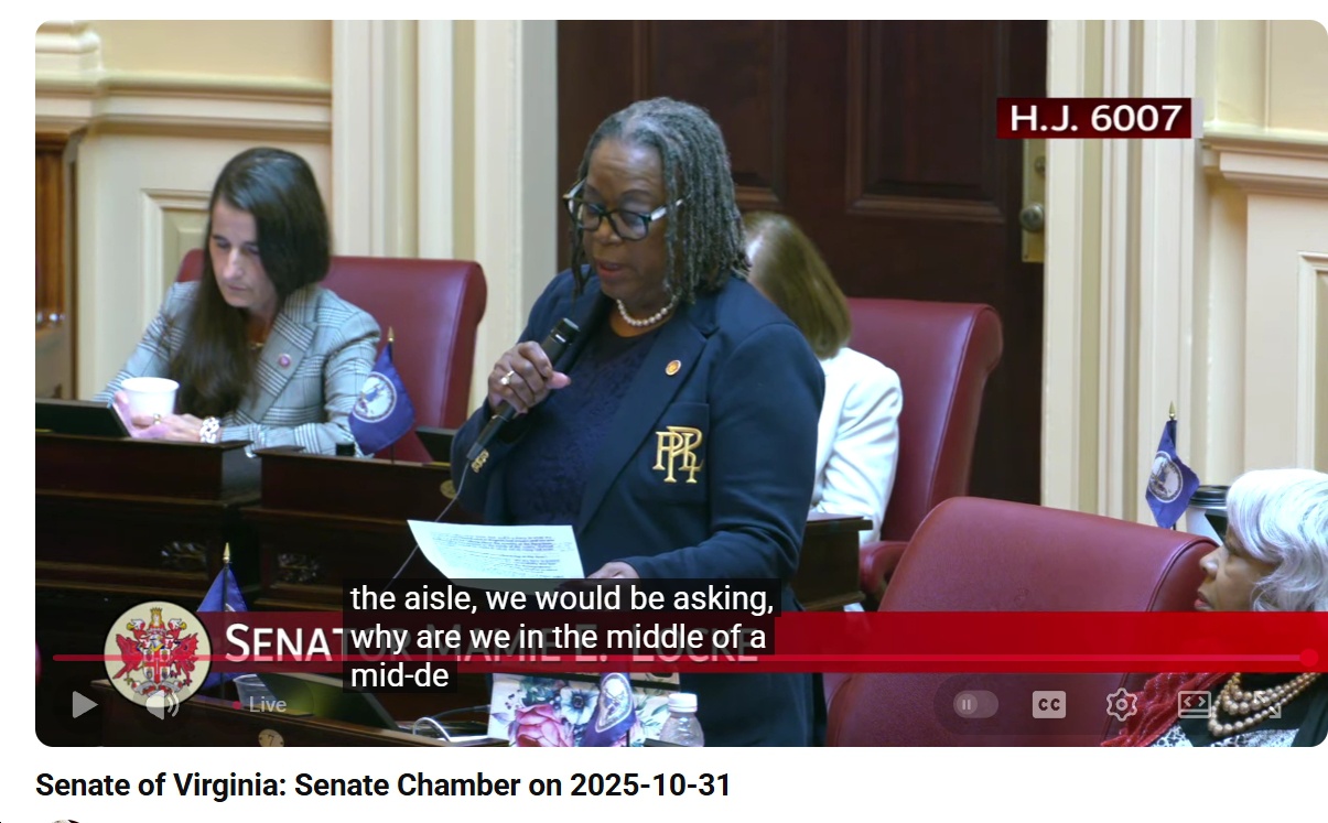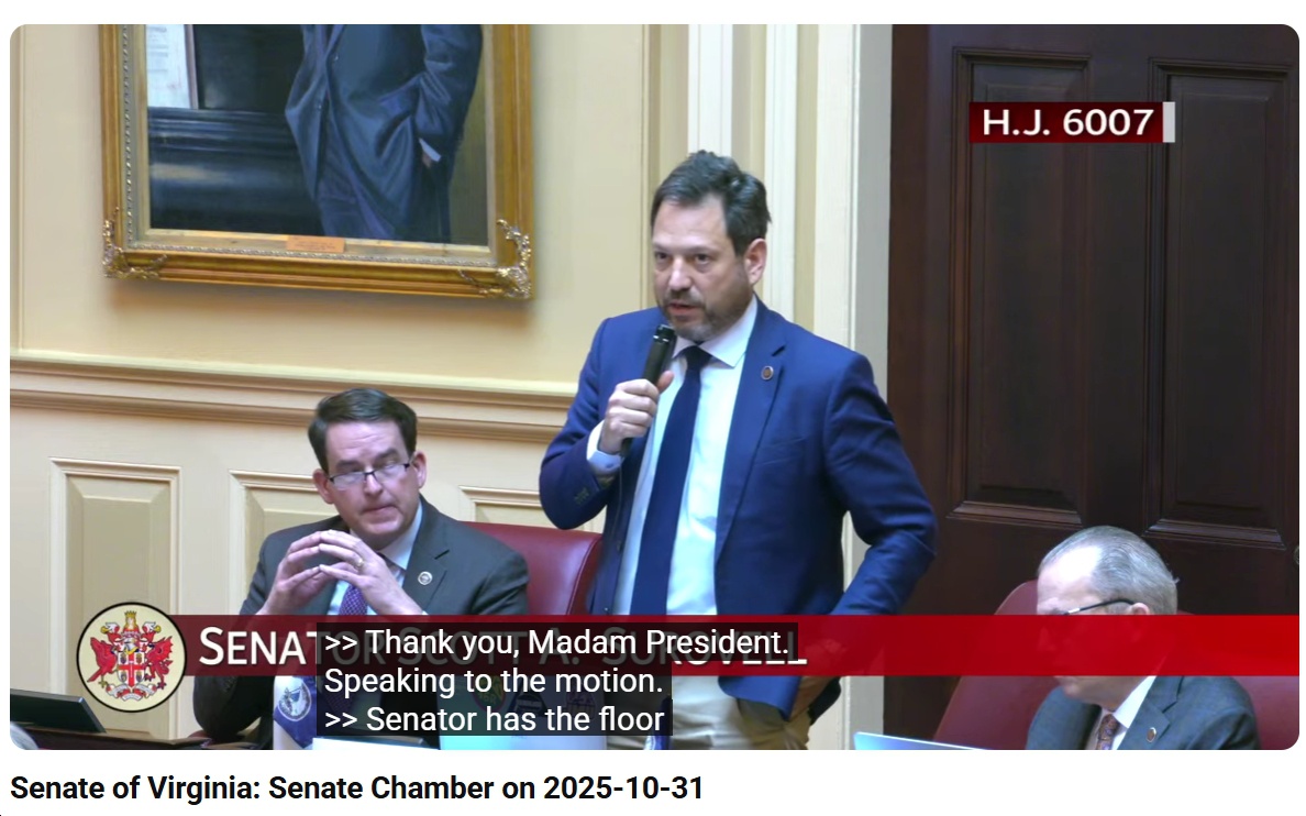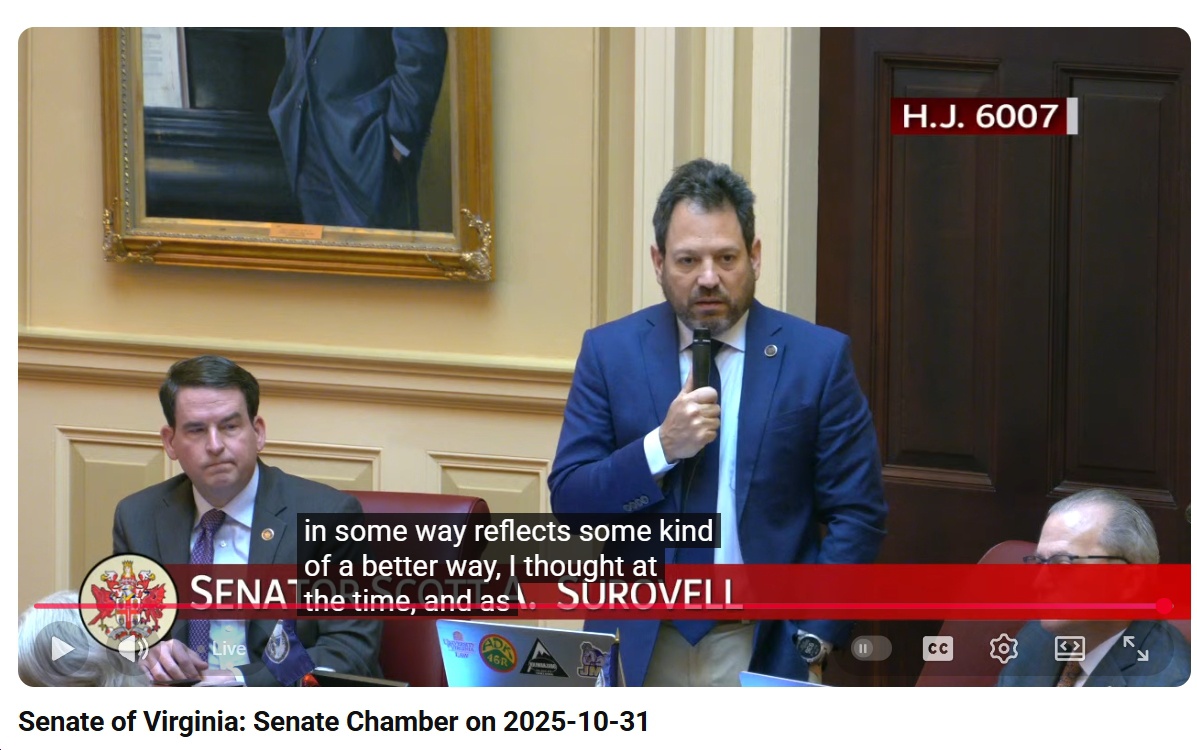 A few minutes ago, the VA Senate voted on a party-line basis to approve HJ6007 (after LOTS of bad-faith blathering/bloviating and wild gaslighting by Senate Republicans, who will never EVER say the words, “Trump is trying to destroy our democracy – which is 100% why Democrats are fighting back, obviously!”). Anyway, see below for some highlights from this morning’s debate, including Sen. Schuyler VanValkenburg’s superb speech, as well as speeches by Sen. Aaron Rouse, Senate Majority Leader Scott Surovell, Sen. Barbara Favola, Sen. Saddam Salim, Sen. Mamie Locke, etc. And for some more background on all of this, including highlights from this week’s debate, see here.