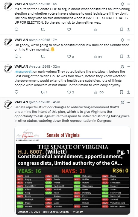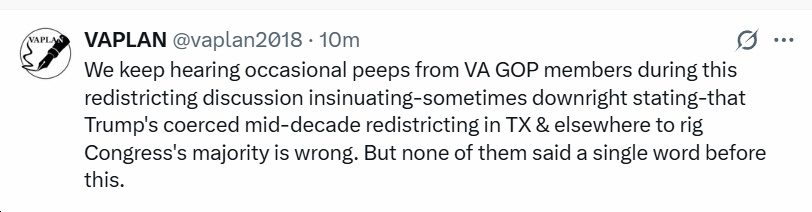 Sen. Schuyler VanValkenburg, possibly the most passionate SUPPORTER of the redistricting amendment among Democrats in the General Assembly, did an excellent job explaining why he’s voting for HJ6007 – it’s not repealing the redistricting commission, and more to the point, “today we are taking a truly proportional response to an extreme situation – the current outbreak of opportunistic, mid-decade redistricting means that we are in a truly unprecedented, constitutional norm-breaking time…we’ve never had a president threaten and strong arm state governors and legislators for changes to their states’ maps for partisan gains – never, that’s a fact, never! Yet that’s exactly what we are seeing now – because of Trump’s jawboning…the reason is because quote, he’s ‘entitled’ to those seats…But what’s really going on here is fear…of facing voters; the president knows that if 2026 is a fair fight, Republicans will lose seats, and he will face a legislative branch willing to stand up to him and check his power. Those are facts. That is why we’re here. Because [President Trump] is trying to avoid accountability and avoid the voters. And so Virginia Democrats are responding proportionately. We’re not trying to end the practice of fair maps. We are asking the voters if, in this one limited case, they want to assure that a constitutional norm-busting president can’t rig the entire national election by twisting the arms of a few state legislatures which haven’t reformed their process like we have…I think what my friends on the other side of the aisle are really afraid of is that the voters are going to agree with us. For all this talk about the will of the voters, I feel pretty confident that if this thing goes to [the voters], they’re going to pass it…and Donald Trump WILL have to face the music in 2026….This resolution is a break-glass maneuver for a truly unpredecented moment…[but] we’re still circling the drain with Donald Trump and the MAGA movement…”
