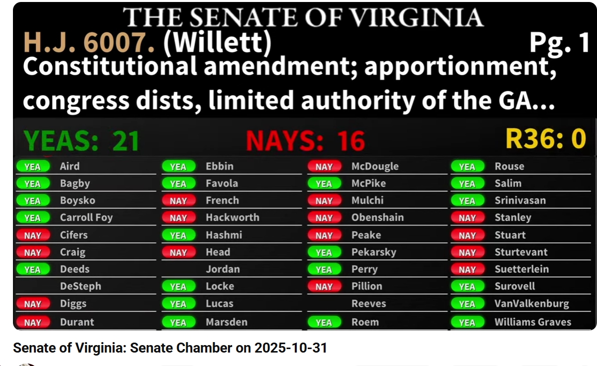 A few minutes ago, the VA Senate voted on a party-line basis to approve HJ6007 (after LOTS of bad-faith blathering/bloviating and wild gaslighting by Senate Republicans, who will never EVER say the words, “Trump is trying to destroy our democracy – which is 100% why Democrats are fighting back, obviously!”). Anyway, see below for some highlights from this morning’s debate, including Sen. Schuyler VanValkenburg’s superb speech, as well as speeches by Sen. Aaron Rouse, Senate Majority Leader Scott Surovell, Sen. Barbara Favola, Sen. Saddam Salim, Sen. Mamie Locke, etc. And for some more background on all of this, including highlights from this week’s debate, see here.