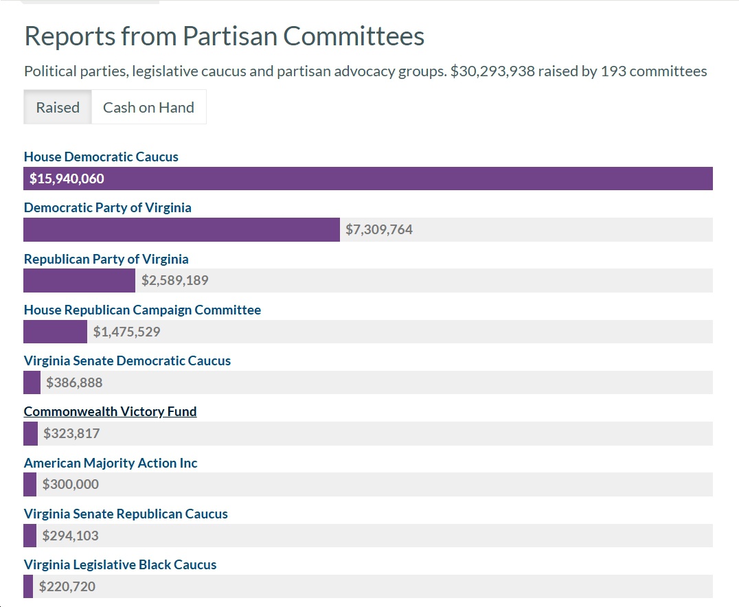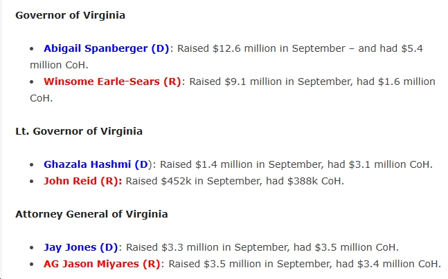- HD75: Democratic nominee Lindsey Dougherty raised $1.56 million in September and had $362k CoH; Republican incumbent Del. Carrie Coyner raised $483k in September and had $284k CoH.