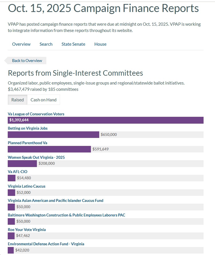 Campaign finance reports (September for Governor, Lt. Governor, Attorney General and House of Delegates; 3Q25 for federal candidates) are coming in now. See VPAP, the FEC and below for information as I see it. (Note: blanks mean that the info isn’t available yet…)
