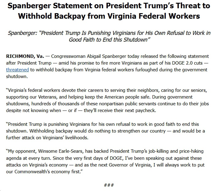 Virginia Delegation Slams White House Threat to Furloughed Workers’ Back Pay