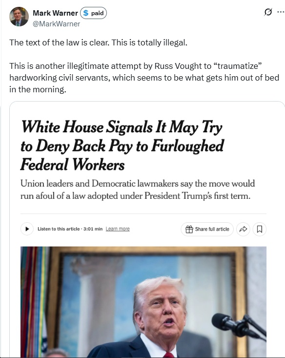 “This is clearly and unambiguously stated in the Government Employee Fair Treatment Act, which Congress passed nearly unanimously in 2019. Speaker Johnson and Senate Majority Leader Thune voted for that bill, and President Trump signed it into law. The Trump Administration recently issued guidance that ‘retroactive pay for period of furlough and excepted work will be provided after the laps ends as required by law.’ Speaker Johnson’s own website correctly affirms that, ‘Under federal law, employees are entitled to back pay upon the government reopening.’