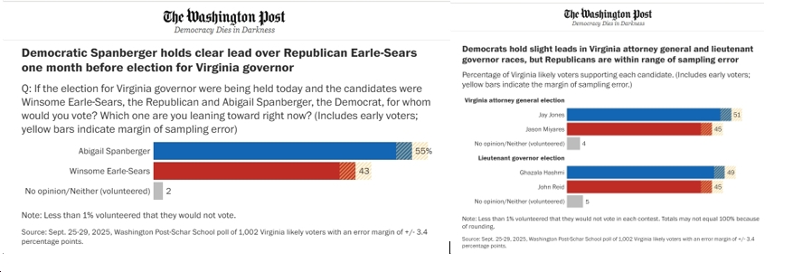 - “Spanberger, a former congresswoman, leads Earle-Sears, the state’s lieutenant governor, by 12 percentage points, 55 percent to 43 percent, among Virginia’s likely voters in the Nov. 4 election.”