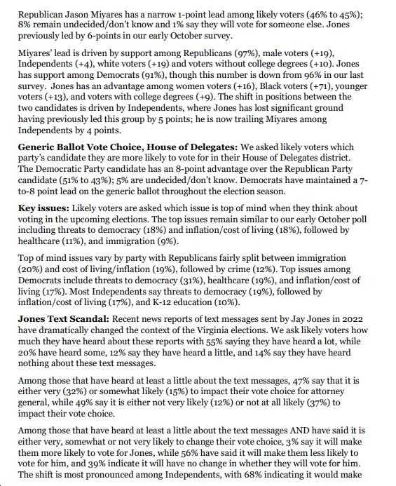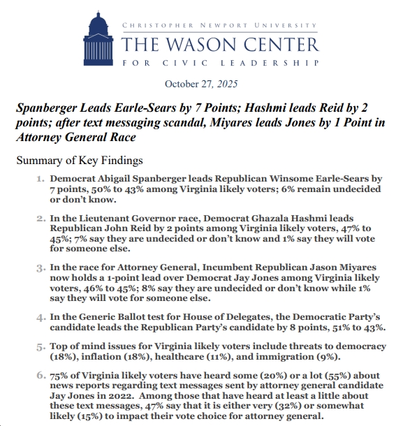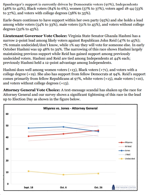 - “In the race for Attorney General, Incumbent Republican Jason Miyares now holds a 1-point lead over Democrat Jay Jones among Virginia likely voters, 46% to 45%; 8% say they are undecided or don’t know while 1% say they will vote for someone else.”