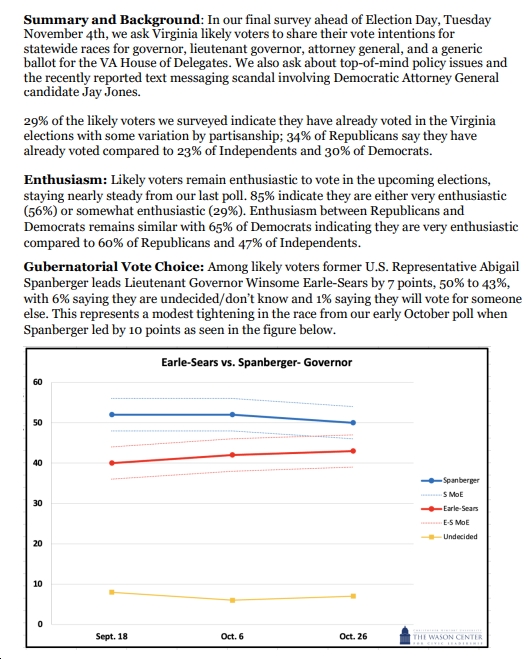 - “Democrat Abigail Spanberger leads Republican Winsome Earle-Sears by 7 points, 50% to 43% among Virginia likely voters; 6% remain undecided or don’t know.”