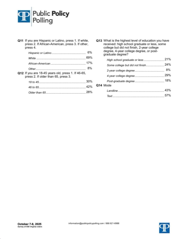 Comparing this poll to some other recent polls: Wason Center three days ago had Spanberger up 10 points; last week’s WaPo/Schar poll had Spanberger up 12 points; an Emerson College poll a week ago had Spanberger up 10 points. So this poll show a point lower lead for Spanberger than Wason and Emerson, three points lower than the WaPo/Schar poll. Pretty similar, all in all..
