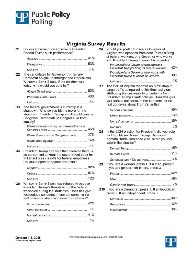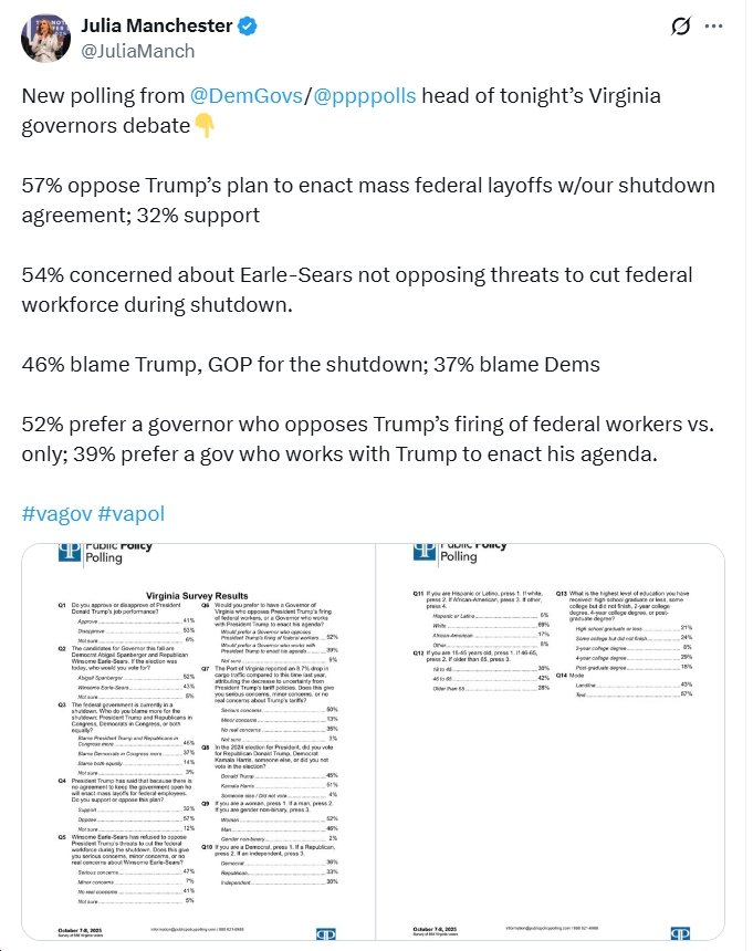 - “32% support 54% concerned about Earle-Sears not opposing threats to cut federal workforce during shutdown”