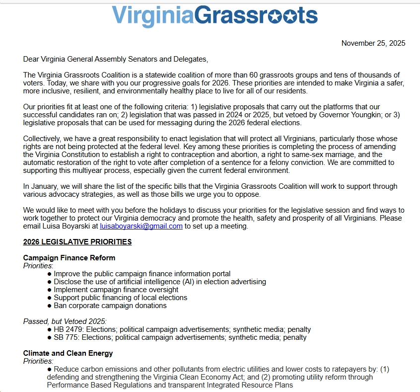 The Virginia Grassroots Coalition is a statewide coalition of more than 60 grassroots groups and tens of thousands of voters. Today, we share with you our progressive goals for 2026. These priorities are intended to make Virginia a safer, more inclusive, resilient, and environmentally healthy place to live for all of our residents.