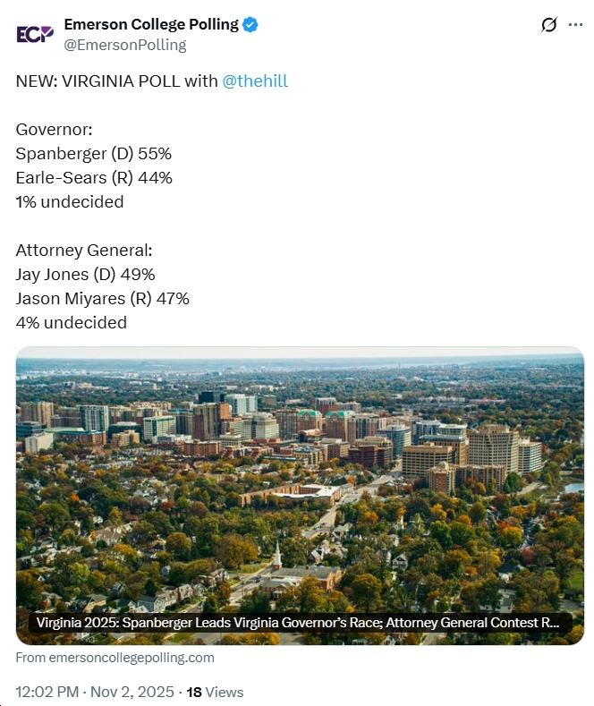- “The final Emerson College Polling/The Hill survey of the Virginia gubernatorial race finds Democrat Abigail Spanberger with an 11-point lead ahead of Republican Winsome Earle-Sears, leading 55% to 44%. Since last month’s survey, Spanberger gained three points while Earle-Sears gained two.”