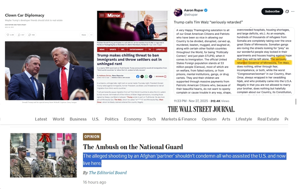 - National Guard member dies as ambush in US capital becomes political flashpoint (It only becomes a “political flashpoint” because Trump and his far-right-extremist administration are making it one!)