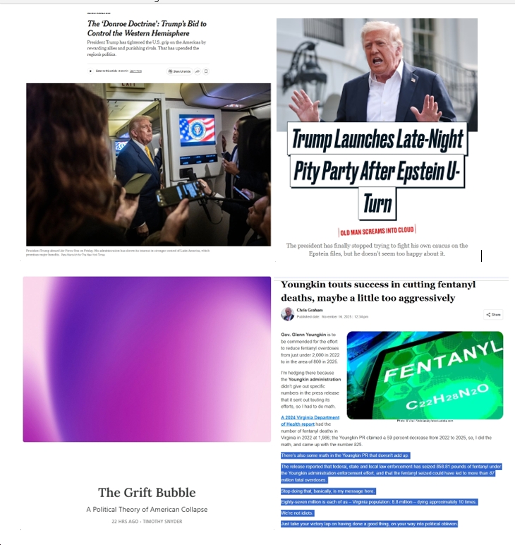 ![Sunday News: Trump About to Start War with Venezuela?; “Trump buys at least $82 million in bonds since late August”; “Why Trump Gets Away With It”; “‘SNL’ Skewers Trump’s Desperate Epstein Distraction Tactics”; “[MTG] says she’s had ‘warnings for my safety’ after posts by Trump”](https://bluevirginia.us/wp-content/uploads/2025/11/montage1116-100x75.jpg)