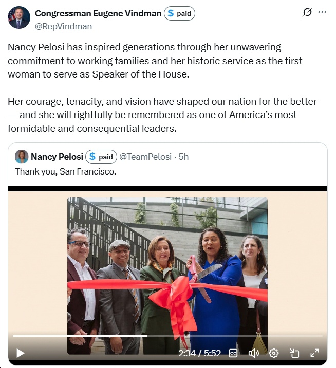 - Rep. Don Beyer (D-VA08): “Nancy Pelosi is a major figure in American history. She’s more than a barrier breaker, she is one of our most brilliant and accomplished leaders, who repeatedly overcame steep odds to deliver results that changed people’s lives for the better. Happy retirement, Madam Speaker.”