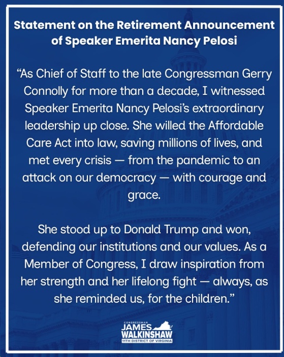 See below for a few reactions, from both national and Virginia politicians, to the news that the greatest Speaker in US history, Nancy Pelosi, is retiring at age 85. Just reading through her bio and accomplishments is almost mind boggling. Also mind boggling is that Republicans hated her so much, demonized her as some sort of commie (which obviously she wasn’t), tried to tie every “swing district” Democrat to her (Earle-Sears tried it against Spanberger this election, even though Spanberger actually voted *against* Pelosi for Speaker – and it totally failed to move any voters Earle-Sears’ way). Those constant attacks by Republicans showed how warped the entire MAGA movement is, but also how obsessed they were by (and afraid of) Pelosi, who mostly ran rings around these incompetent buffoons. On a related note, who can forget the deranged sh** many Republicans (including Glenn Youngkin) said after Pelosi’s husband was brutally attacked in his home?