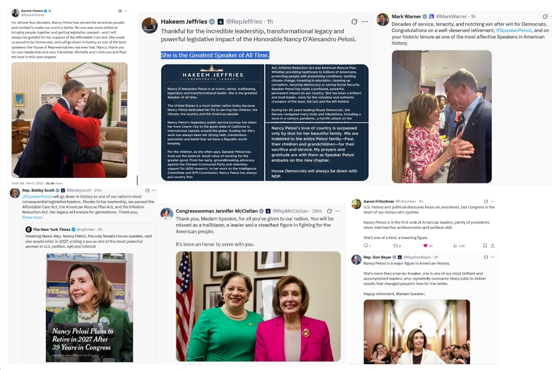 - Rep. Bobby Scott (D-VA03): Nancy Pelosi “will go down in history as one of our nation’s most consequential legislative leaders. Thanks to her leadership, we passed the Affordable Care Act, the American Rescue Plan Act, and the Inflation Reduction Act. Her legacy will endure for generations. Thank you, Madam Speaker!”
