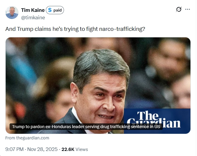 From Sen. Tim Kaine on one of the latest outrages by the utterly corrupt Donald Trump – this time, pardoning “Juan Orlando Hernández, the former president of Honduras who is serving a 45-year prison sentence in the US on drug trafficking and weapons charges.” As Sen. Kaine says, “This is a disgusting and incomprehensible decision by Trump, and Americans whose lives have been destroyed by narcotraffickers like Ulbricht and Hernández deserve better.”