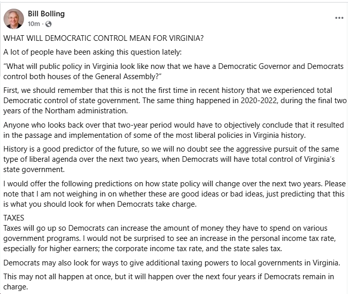 “What will public policy in Virginia look like now that we have a Democratic Governor and Democrats control both houses of the General Assembly?” (Again, keep in mind that Democrats only will have a 21-19 majority in the State Senate, and possibly even only 20-19 for a while…or even 19-19 if any Democratic Senator goes into the Spanberger administration? Also note that VA Speaker Don Scott has stated: “The word of the day now is restraint. We can’t overreach. We have to be restrained. We have to be wise with the gift that the voters have given us to govern. We have to be wise in how we move forward, so it’s gonna be important for us to have a coalition that’s restrained, that’s smart, that’s disciplined and focused on what voters want us to do. They told us what they want. All we have to do is listen. They’re feeling the pain in the pocketbook. We got to stay focused on kitchen table issues, but they also are afraid that our democracy is eroding and being attacked, and they want us to stand up, and that’s what we’re gonna do…”)