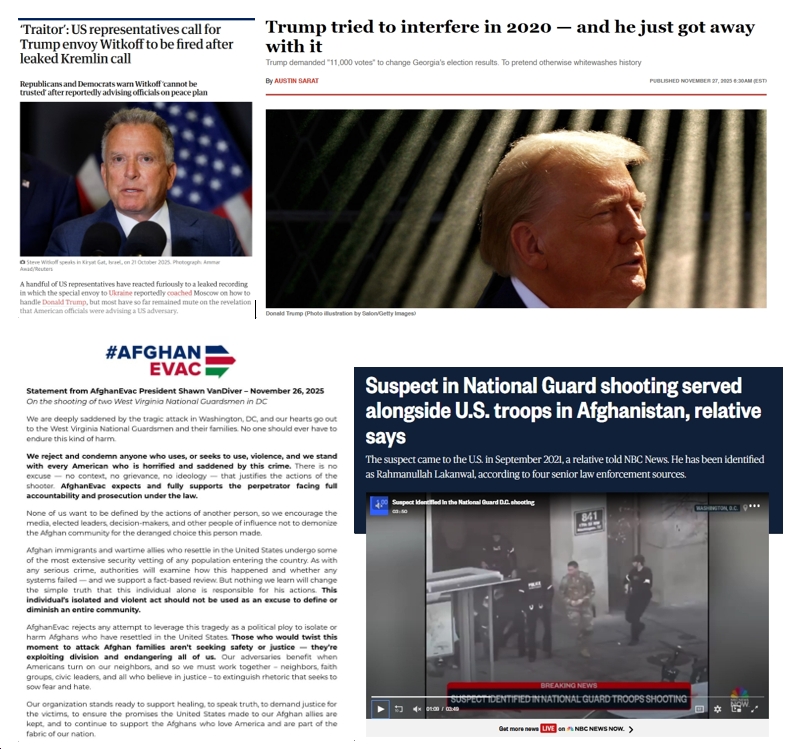- Statement from AfghanEvac (“Our hearts go out to the brave guardsmen attacked today. We will not let the action of one deranged asshole be the excuse used to cause harm to an entire community of people”; “This individual’s isolated and and violent act shouldn’t be used as an excuse to define or diminish an entire community.”)