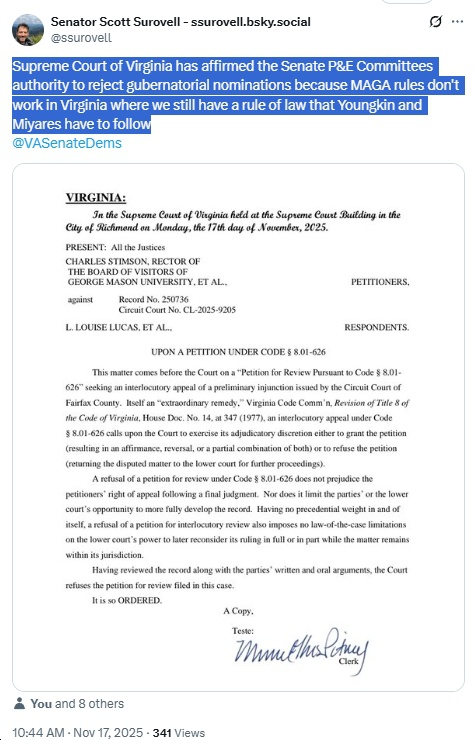 “Supreme Court of Virginia has affirmed the Senate P&E Committees authority to reject gubernatorial nominations because MAGA rules don’t work in Virginia where we still have a rule of law that Youngkin and Miyares have to follow”