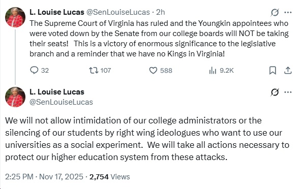 See below for some reactions to today’s Virginia Supreme Court ruling “leaving in place a lower court’s order that blocked 22 of Governor Glenn Youngkin’s disputed appointments to Virginia’s university boards” (per VA Senate Privileges and Elections Committee Chair Aaron Rouse’s press release). As VA Senate Majority Leader Scott Surovell says: