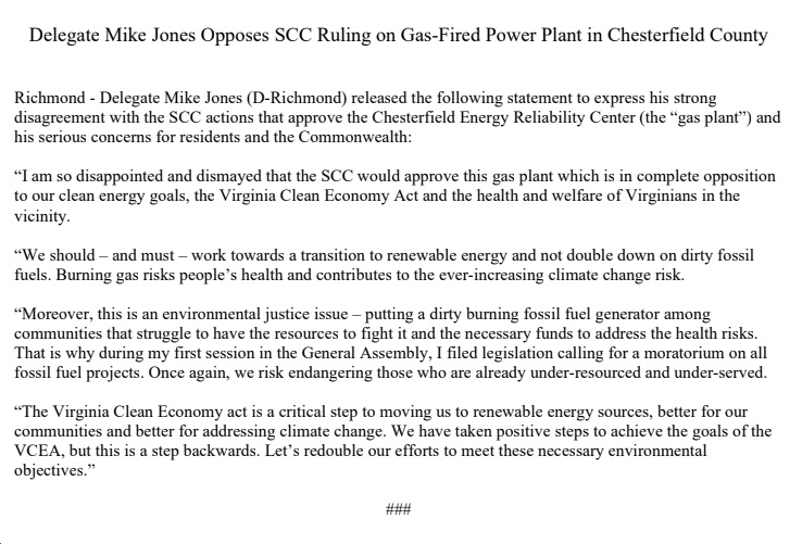 “As a legislator who represents the area in which this gas peaker plant will be sited and who has been engaged in raising concerns about it for nearly two years, I have heard from those who live in this community as well as legislators from across the Commonwealth who understand not only what this decision means for the residents of Chesterfield County, but also the precedent it sets for Virginia.
