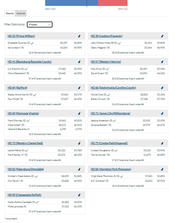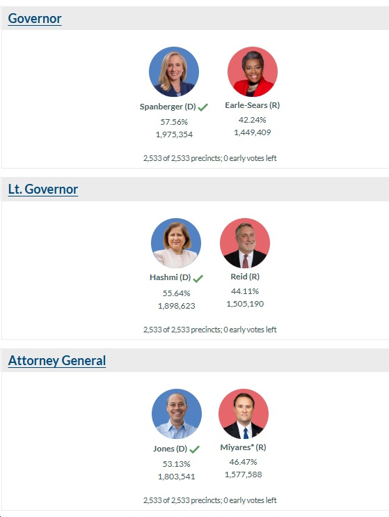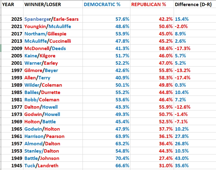 - First, from VPAP, here are the final results from the 2025 Virginia elections: Abigail Spanberger defeated Winsome Earle-Sears by 15+ points (57.6%-42.2%); Ghazala Hashmi defeated John Reid by 11.5 points (55.6%-44.1%); Jay Jones defeated Jason Miyares by nearly 7 points (53.1%-46.5%); Democrats flipped 13 Republican-held House of Delegates seats, going from a 51D-49R House of Delegates narrow majority to a massive 64D-36R House of Delegates majority.